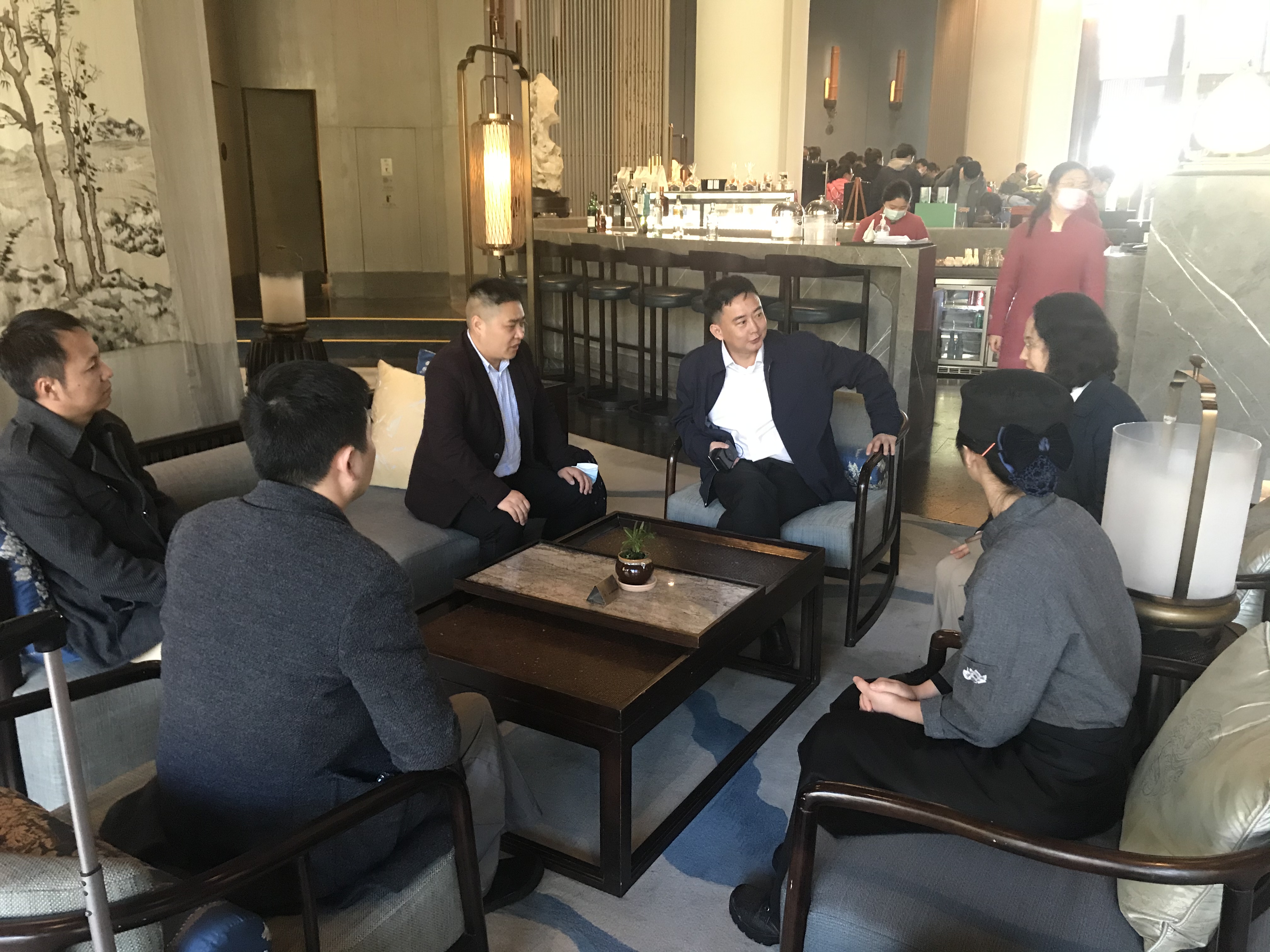 在拈花湾5A级旅游度假区,老师们看望了在区内波罗蜜多酒店中西点部实习的蒙珊珊、符亚梅两位同学,询问了她们实习期间的工作、学习和生活情况;随后与无锡市旅游协会曹晓彬会长、酒店人力资源部白银俊总监开展会谈,吉家文经理向行业企业高管介绍了公司专业建设和员工实习就业的情况,曹会长表示公司的员工在实习期间扎实肯干,表现突出,获得了企业和客人的一致好评,双方还将继续开展深入合作。
